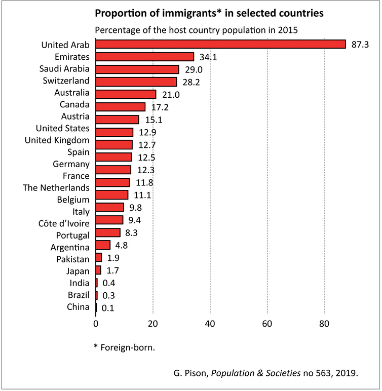 Sa më i vogël të jetë vendi, aq më i lartë është numri i banorëve të huaj. Në anën tjetër, sa më e madhe të jetë vendi, aq më i vogël do të jetë ky proporcion. Në vitin 2015, India kishte 0.4% të emigrantëve dhe Kina 0.07%.