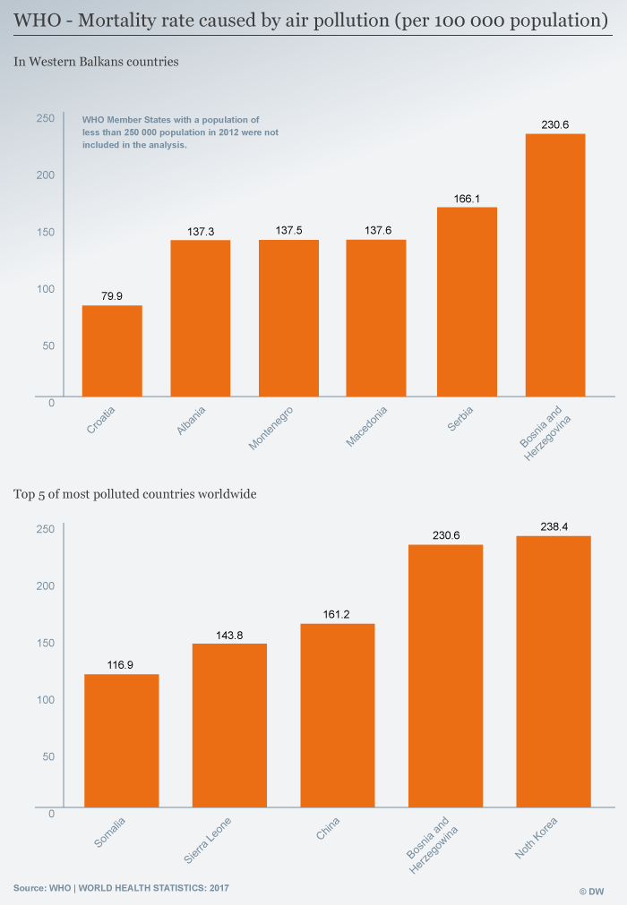 Bosnjë-Hervegovina renditet si vendi më i prekur me numrin më të lartë të viktimave, duke u ndjekur ne listë nga fqinjët e tjerë të Ballkanit, Shqipëria e më pas Mali i Zi, Kosova, Maqedonia e Serbia. Rajoni i Ballkanit është pjesa e Evropës me atmosferën më të ndotur.