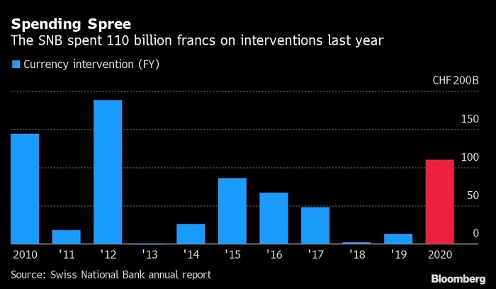 Banka Qendrore e Zvicrës SNB shpenzoi 110 miliardë franga (118 miliardë dollarë) për ndërhyrje në valuta të huaja gjatë vitit 2020, dëshmi e rritjes së aktivitetit të tregut që rrezikon përshkallëzimin e tensioneve me Shtetet e Bashkuara, sipas Bloomberg, përcjell albinfo.ch.
