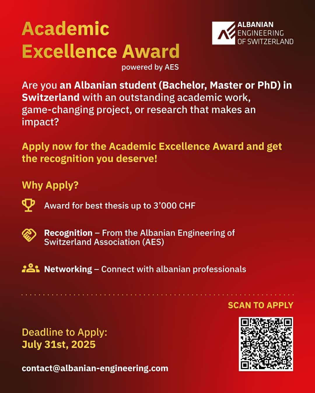 Shoqata e Inxhinierëve Shqiptarë në Zvicër, Albanian Engineering of Switzerland (AES), për herë të parë ndan Çmimin për Përsosmëri Akademike.