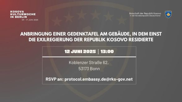 Kemi kënaqësinë t’ju ftojmë të merrni pjesë në ceremoninë e zbulimit të pllakatës në ndërtesën ku ishte e vendosur Qeveria në ekzil e Republikës së Kosovës gjatë viteve 1995–1999, në qytetin e Bonit.