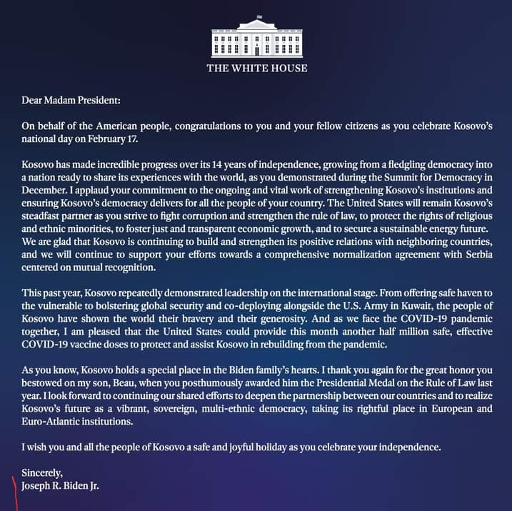 - Biden uron Kosovën, thotë se dialogu duhet të përfundojë me njohjePresidenti amerikan Joe Biden ka dërguar telegram urimi me rastin e...