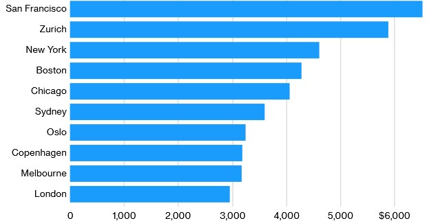 Të ardhurat në San Francisko janë llogaritur 6 526 dollarë, derisa në Cyrih 5 896 dollarë, përcjell tutje albinfo.ch.