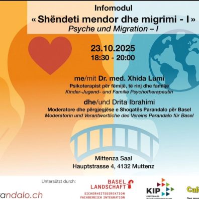 Das Thema dieses Treffens lautet ” Psychische Gesundheit und Migration I (Shëndeti mendor dhe migrimi I) mit Dr. med. Xhida Lumi, Psychotherapeutin für Kinder, Jugendliche und Familien, sowie Drita Ibrahimi, Moderatorin und Verantwortliche des Vereins Parandalo für Basel.