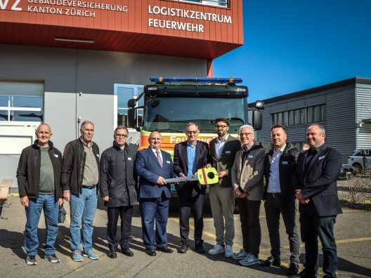 Im Logistikzentrum der GVZ in Bachenbülach hat Regierungsrat und Verwaltungsratspräsident der GVZ, Mario Fehr, der Feuerwehr Gjilan im Kosovo ein Tanklöschfahrzeug übergeben.