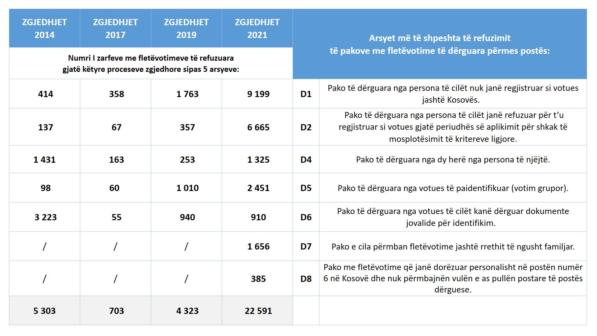 Sipas KQZ-së, numri i lartë i fletëvotimeve të refuzuara, është rezultat i arsyeve të ndryshme. 9 mijë e 199 zarfe, janë refuzuar për arsye se pakot janë dërguar nga persona që nuk janë të regjistruar si votues jashtë Kosovës. Ndërsa, 6 mijë e 665 pako, janë refuzuar sepse ato janë dërguar nga persona të cilët janë refuzuar për t’u regjistruar si votues gjatë periudhës së aplikimit për shkak të mosplotësimit të kritereve ligjore.
