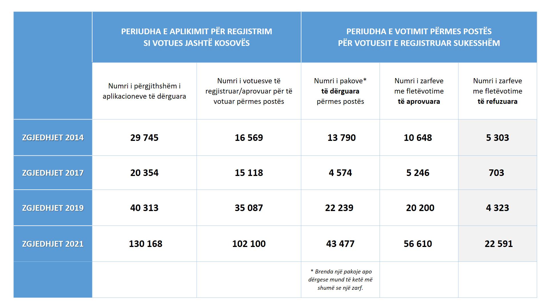Numri i votuesve të regjistruar/aprovuar për të votuar përmes postës, në Zgjedhjet 2021, ka qenë 102,100, numër ky shumë i lartë në krahasim me Zgjedhjet e vitit 2019, ku numëri i votuesve përmes postës ka qenë 35,087, ndërsa në Zgjedhjet 2017, ky numër ishte vetëm 15,118.