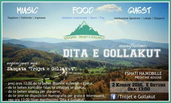 Shoqata “Trojet e Gollakut”që një kohë ka kryer një serë veprimesh dhe aktivitetesh nga e cila kjo datë do te shënohet me aktivitete të ndryshme ne fusha përkatëse dhe shëndetësore qe t’i dilet në ndihmë kësaj zone.