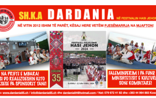 - SHKA “Dardania” nga Winterthuri do të marrë pjesë në festivalin folklorik “Hasi Jehon”Me ftesën e SHKA “MALËSORI”, Këshillit drejtues të këtij festivali dhe...