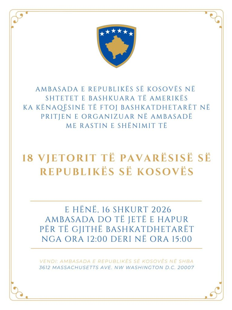 Ambasada e Kosovës në Shtetet e Bashkuara të Amerikës ka ftuar bashkatdhetarët të festojnë së bashku 18-vjetorin e shpalljes së pavarësisë së Kosovës.