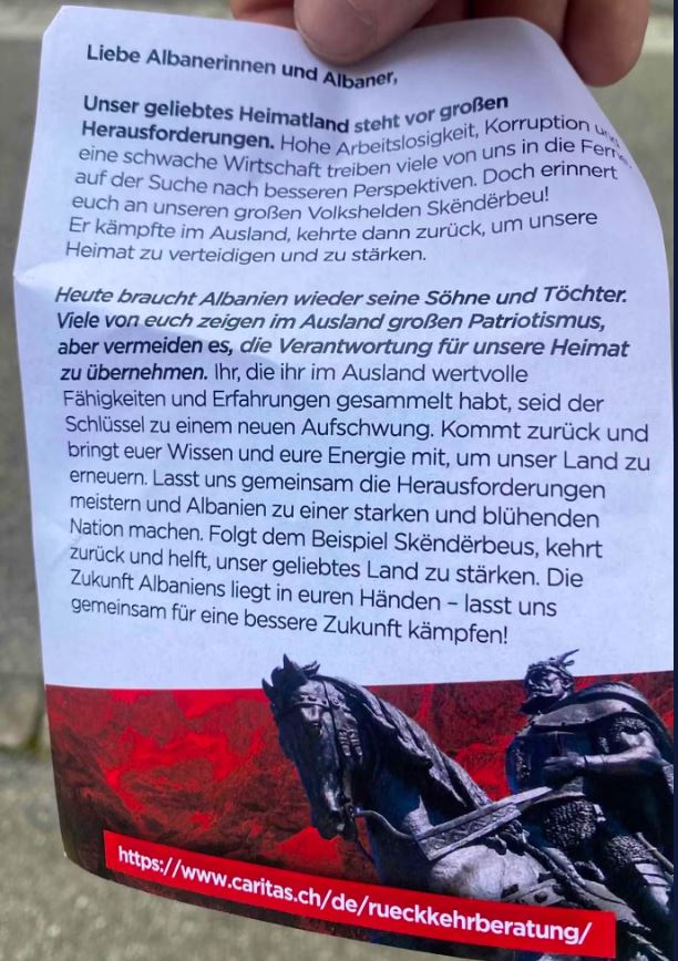 “Nëse fletushka është shkruar nga grupe ekstremiste të krahut të djathtë zviceran, do të ishte një mënyrë e re për të inkurajuar emigrantët që të bëjnë të ashtuquajturin ‘riemigrim’”, thotë eksperti i ekstremizmit, Dirk Baier. Ai shpjegon: “Meqenëse nuk ka dërgues, ju nuk mund ta dalloni këtë qëllim në shikim të parë, transmeton albinfo.ch. Megjithatë, referenca për Caritas-in zbulon qëllimin: i referohet shërbimit të tyre këshillues për kthimin, i cili në fakt ishte krijuar për kriminelët që u dënuan me dëbim nga vendi.
