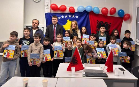 En conclusion de l’événement, l’enseignante Alma Selimi Zyberi, aux côtés du consul Gashi, a distribué les manuels scolaires aux élèves. Ces livres sont un don du ministère de l’Éducation de la République d’Albanie et du ministère de l’Éducation de la République du Kosovo destiné aux enfants albanais de la diaspora.
