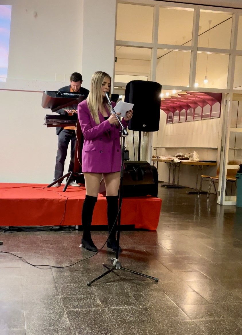 Ai në fund ftoi në skenë zonjën Begije Berisha dhe e falënderoi përzemërsisht për këmbënguljen e saj nga organet e komunës së Altdorfit, që sallën ta kemi në disponim pa pagesë! E në shenjë falënderimi, znj. Berisha iu dhurua një buqetë lulesh.