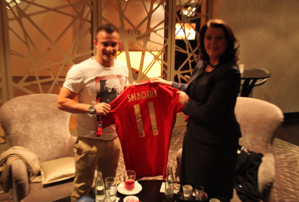 Presidentja Jahjaga e ka përgëzuar Xherdan Shaqirin për lojën dhe shpirtin sportiv që po e tregon në fushën e futbollit. Ajo tha se të rinjtë nga Kosova kanë treguar vlerat e tyre kudo në botë, në të gjitha fushat dhe po dëshmojnë gjithë talentin e tyre në të gjitha fushat e jetës.