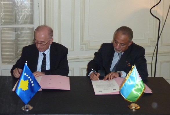 Ambasadori i Republikës së Kosovës në Francë, Muhamedin Kullashi dhe ambasadori i Republikës së Xhibutit në Francë, Rachad Farah, kanë nënshkruar protokollin për vendosjen e marrëdhënieve diplomatike bilaterale, njofton Ministra kosovare e Punëve të Jashtme.