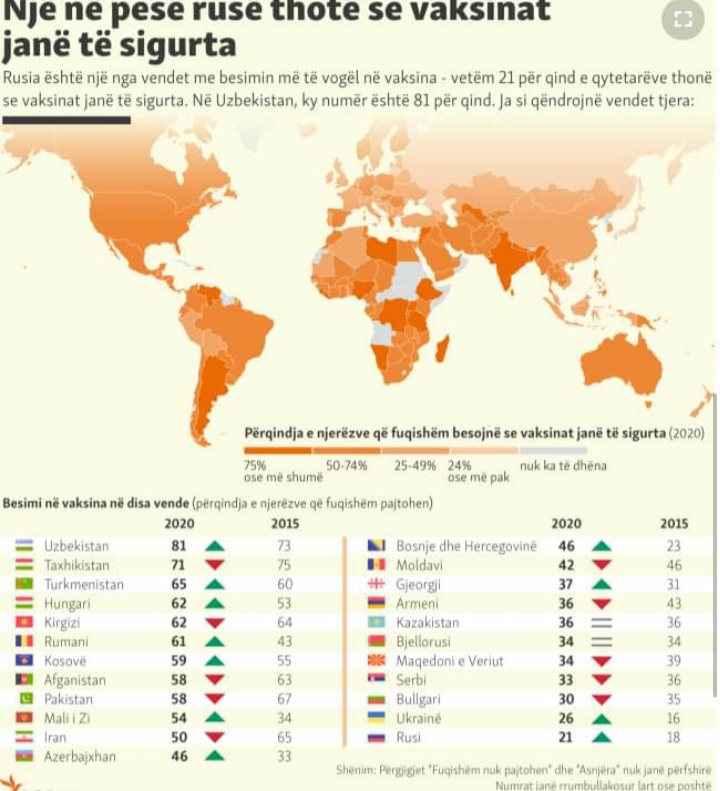 Kurse vendi ku qytetarët më së paku besojnë se vaksina është e sigurt, është Rusia, me 21 për qind.
