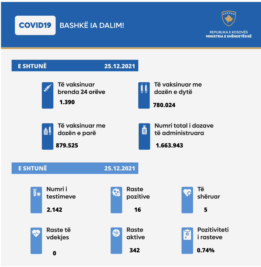 Ministria e Shëndetësisë, sipas të dhënave nga Instituti Kombëtar i Shëndetësisë Publike të Kosovës, informon se nga 2.142 testime, 16 qytetarë kanë rezultuar pozitiv me virusin COVID-19.