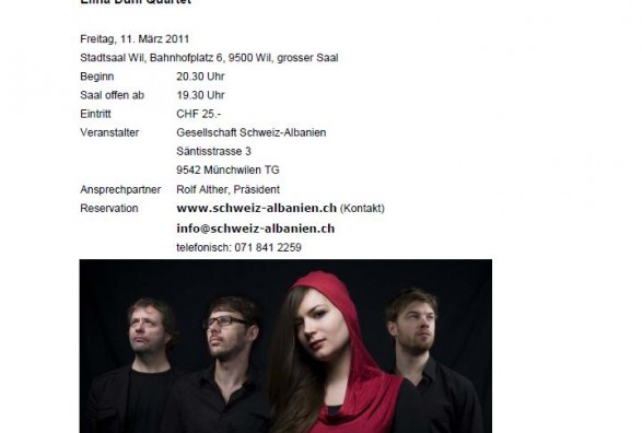 Shoqata Zvicër-Shqipëri, në kuadër të aktiviteteve të saj drejt njohjes më të mirë të të dyja vendeve, organizon një koncert me këngëtaren e njohur shqiptare të xhazit Elina Duni dhe kuartetin e saj.