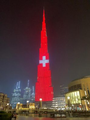 Në ditën nacionale zvicerane, ndërtesa më e lartë në botë ajo e Emirateve të Bashkuara, ka marrë ngjyrat kuq e bardh ashtu siç duket flamuri zviceran.