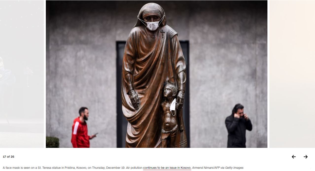 Imazhi i përzgjedhur është ai ku duket statuja e Nënës Terezë në Prishtinë me maskë të vendosur në fytyrë, si shenjë vetëdijesimi dhe proteste për shkak të ajrit të ndotur, shkruan GE, përcjell albinfo.ch