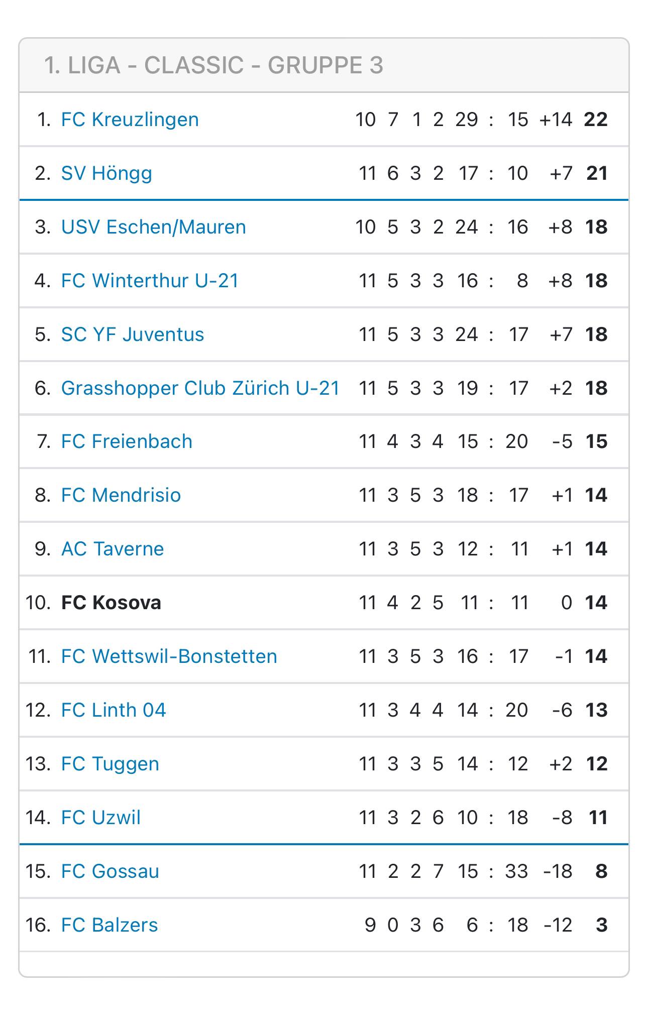 FC Kosova ndodhet aktualisht në vendin e dhjetë në tabelë dhe në ndeshjen e ardhshme do të jetë mysafir i FC Mendrisio në Zvicrën Jugore.