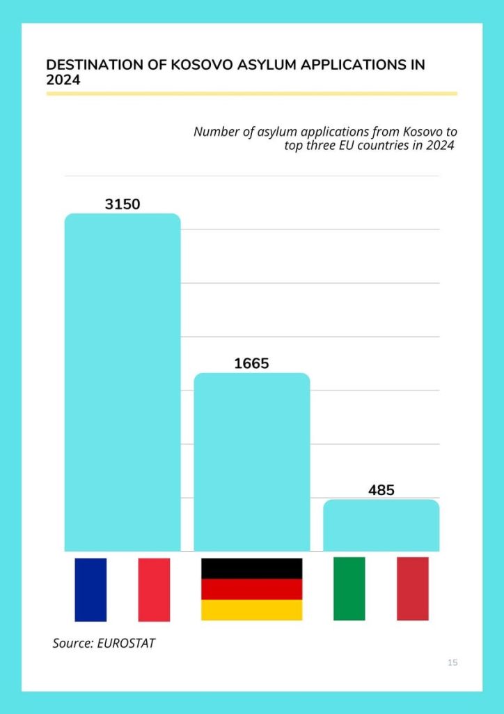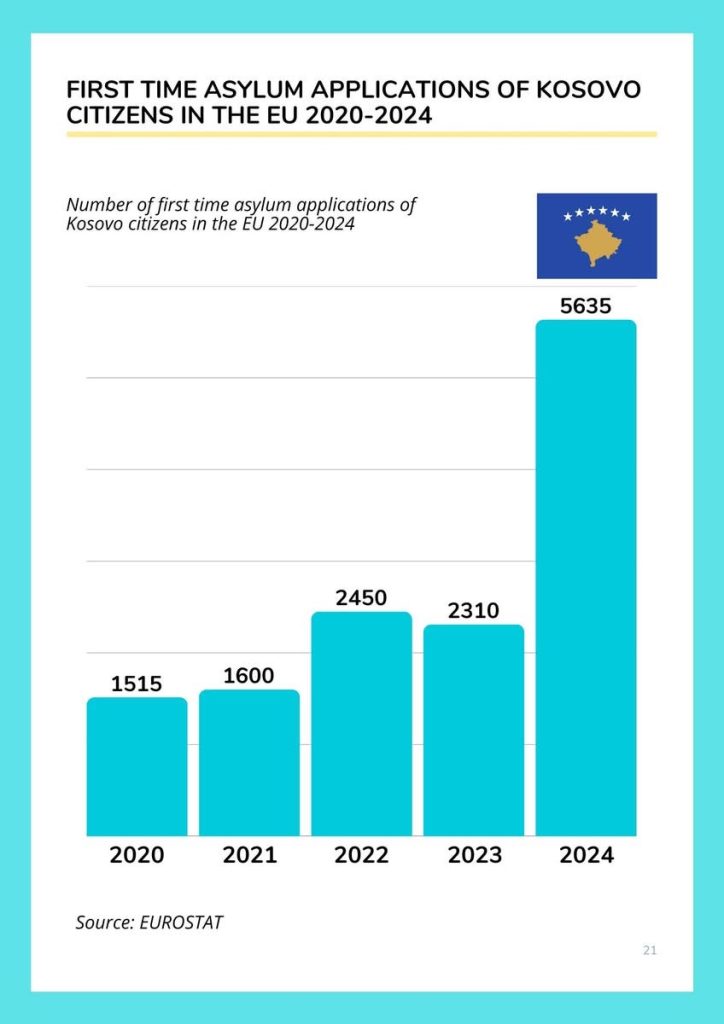 Gjatë vitit 2024 janë regjistruar gjithsej 5,635 kërkesa për azil nga qytetarët e Kosovës në vendet e Bashkimit Evropian. Destinacionet kryesore ku qytetarët kosovarë kanë kërkuar azil kanë qenë Franca me 3,150 kërkesa, Gjermania me 1,665 kërkesa dhe Italia me 485 kërkesa.