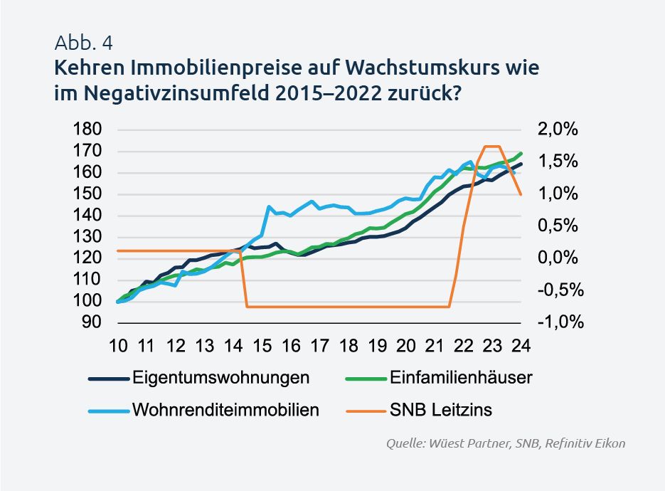 Por një ulje është e parashikueshme: bankat nuk po kalojnë norma negative interesi te klientët e hipotekave, por po rrisin marzhet e tyre ose po vendosin një normë interesi referencë prej 0% (Fig. 3). Financimi SARON është veçanërisht i prekur, pasi nuk mund të përfitojë nga normat bazë negative të interesit për shkak të një kufiri më të ulët 0% të rënë dakord me kontratë. Megjithatë, ky zhvillim ofron mundësi: klientët privatë mund të marrin hipoteka afatgjatë me kushte tërheqëse, ndërsa investitorët me përvojë të pasurive të paluajtshme mund të optimizojnë financimin e tyre të jashtëm dhe të anashkalojnë në mënyrë strategjike kufirin e poshtëm.