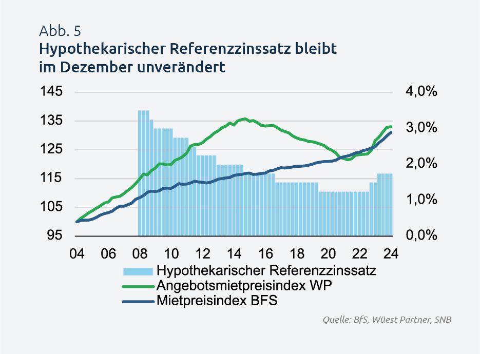 Deri më tani, qiramarrësit nuk kanë përfituar drejtpërdrejt nga normat më të ulëta të interesit, pasi norma e referencës së hipotekës ka mbetur e pandryshuar në dhjetor (Fig. 5). Megjithatë, për shkak të rregullimit të vonuar në krahasim me normat e interesit të tregut, pritet një ulje në mars 2025, e cila mund të ulë qiratë ekzistuese për shumicën e familjeve me rreth 3%. Normat e përhershme të ulëta ose në rënie të mëtejshme të interesit duhet gjithashtu të stimulojnë aktivitetin e ndërtimit dhe të kundërshtojnë mungesën e banesave. Kjo mund të zvogëlojë presionin për të kërkuar qira të viteve të fundit – një avantazh edhe për qiramarrësit që duan të lëvizin.