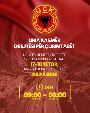 “Rruga e Kombit pa pagesë në datë 17 Tetor. ‘Liria ka emër – Drejtësi për çlirimtarët’, bashkohemi në Tiranë për drejtësi, dinjitet dhe të vërtetën e luftës çlirimtare të Kosovës”, ka shkruar ajo.