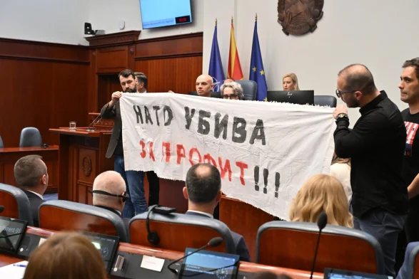 Ekstremistët nacionalistë në opozitë, të cilët përfaqësohen nga 6 deputetë, shpalosën një banderolë të madhe përpara podiumit, ku shkruhej “NATO vret për përfitim”, transmeton albinfo.ch.