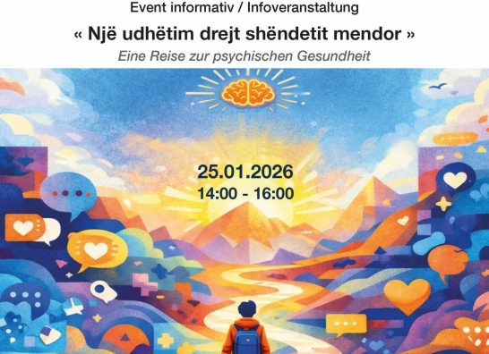 Shoqata PARANDALO organizon eventin informativ “Një udhëtim drejt shëndetit mendor”, më 25 janar 2026, nga ora 14:00–16:00, në Qendrën PARANDALO, Wallisellenstrasse 429, 8050 Zürich.