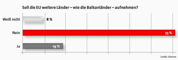 73 përqind e austriakëve janë kategorikisht kundër zgjerimit të BE-së. Kjo bëhet me dije nga anketa e pjesës së dytë të publikuar prej institutit Akonsult për mediat rajonale austriake, shkruan albinfo.ch. Vetëm 19 përqind mbështesin zgjerimin e BE-së, duke u përmendur ekskluzivisht gjashtë vendet e Ballkanit Perëndimor, ndërsa 8 përqind janë përgjigjur “nuk e dinë”.