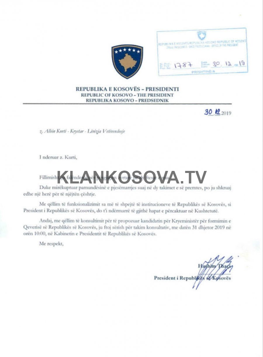 “Andaj, me qëllim të konsultimit për të propozuar kandidatin për Kryeministër për formimin e Qeverisë së Republikës së Kosovës, ju ftoj sërish për takim konsultativ më 31 dhjetor 2019, në orën 10:0, në Kabinetin e Presidentit të Republikës së Kosovës”, ka shkruar i pari i vendit në letrën e tretë dërguar Kurtit.